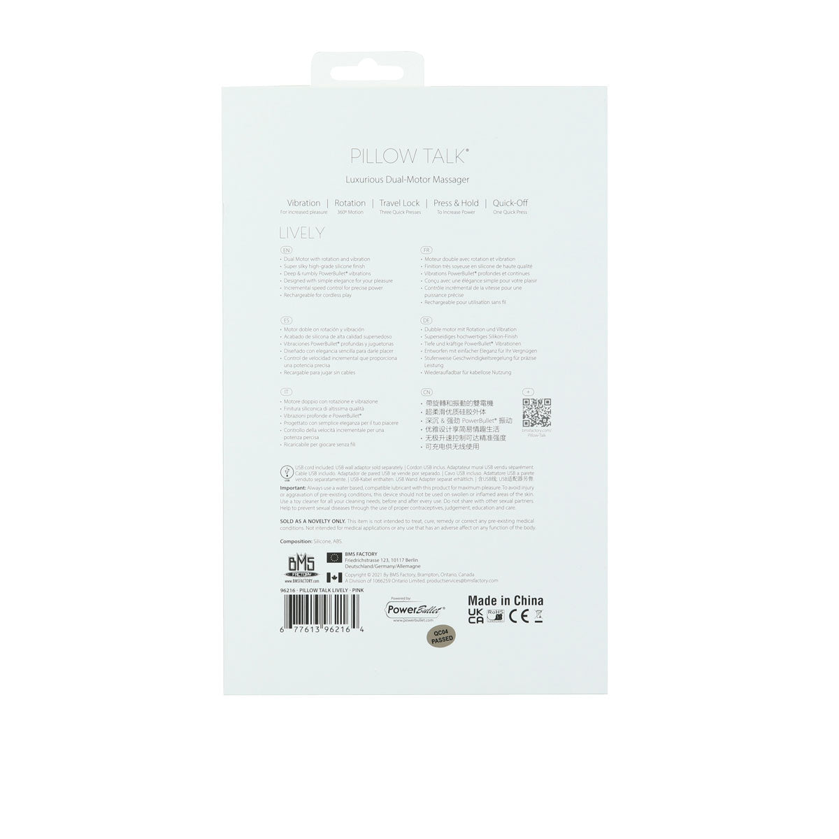 Pillow Talk is a collection of expresses beauty, fun and power. Lively is a luxurious dual-motor vibrator that combines diverse elements of pleasure for complete satisfaction. While the curved shaft uniquely rotates for incredible G-spot stimulation, the 3-point rabbit attachment vibrates for astonishing clitoral stimulation.