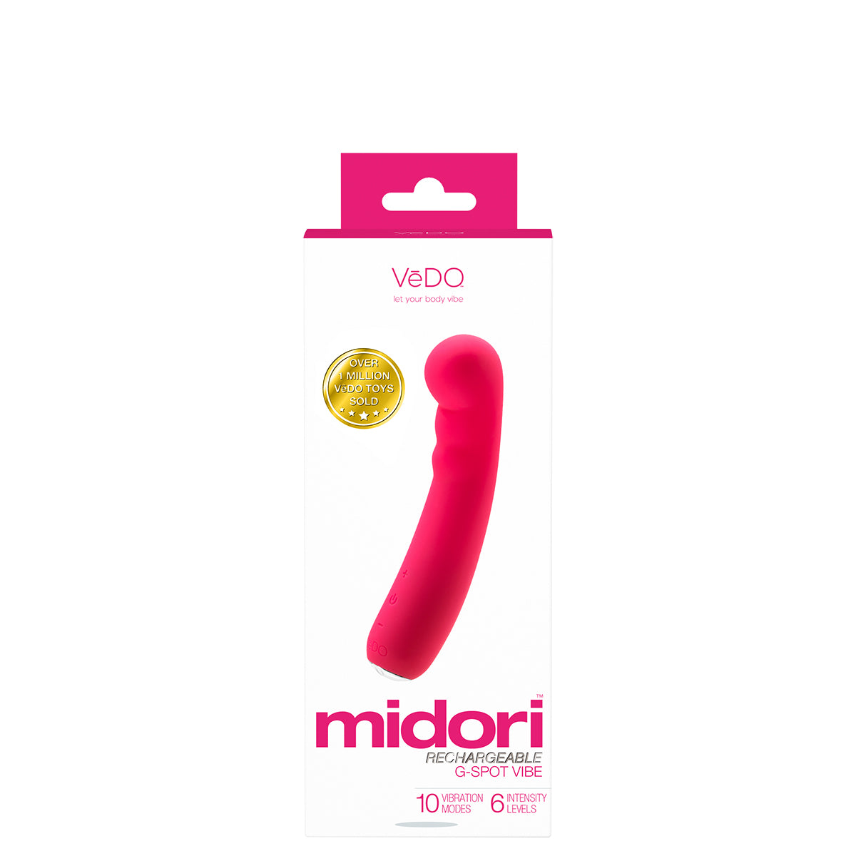 Midori boasts 10 powerful vibration modes with 6 intensity levels. Made of velvety smooth silicone with a flexible, textured shaft and bulbous head, Midori makes teasing and pleasing the G-spot oh so easy and fun. Whisper quiet and completely submersible, this super cute vibrator loves water play and is a must have for the "toy box".