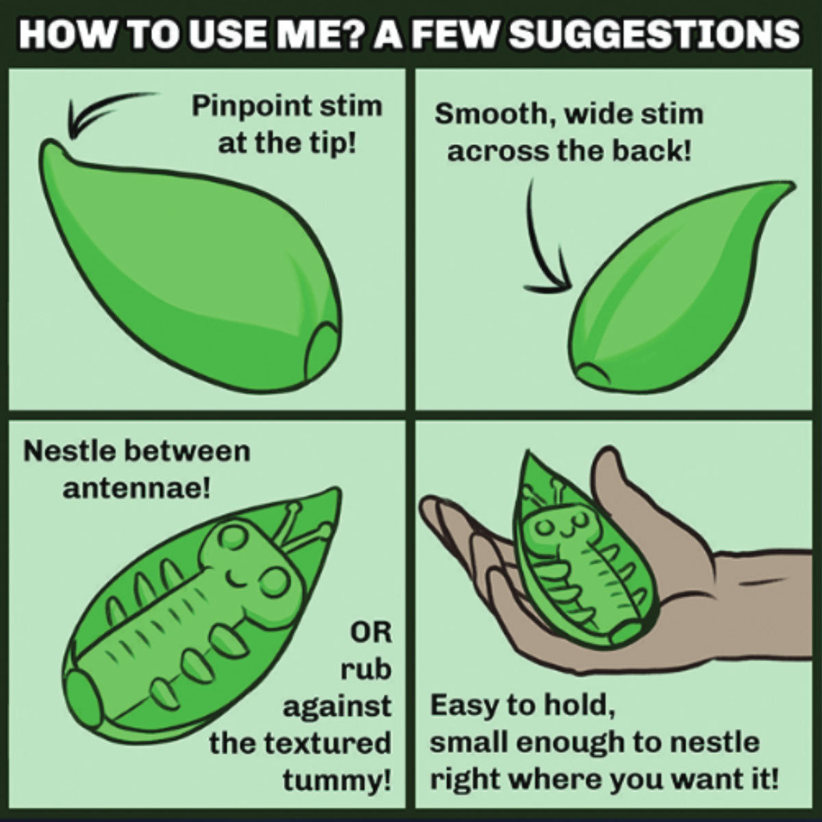 Zeep comes from a lush and varied jungle world, so Zeep loves the variety and uniqueness of every body. The sly and shy Zeep hides in its leaf waiting to jump out & playfully surprise with the power of its vibrations and the breadth of pleasure it has to share with its new friend. The tip of Zeep's leaf creates soft yet supportive pinpoint sensation, thin enough to reach enjoyably sensitive areas ever during crowded partner play. The back of Zeep's leaf creates wide smooth stimulation, while on the other side Zeep loves to tickle with all the textures on its tummy or the space between its antennae. Zeep is a friend as varied and unique as you are.