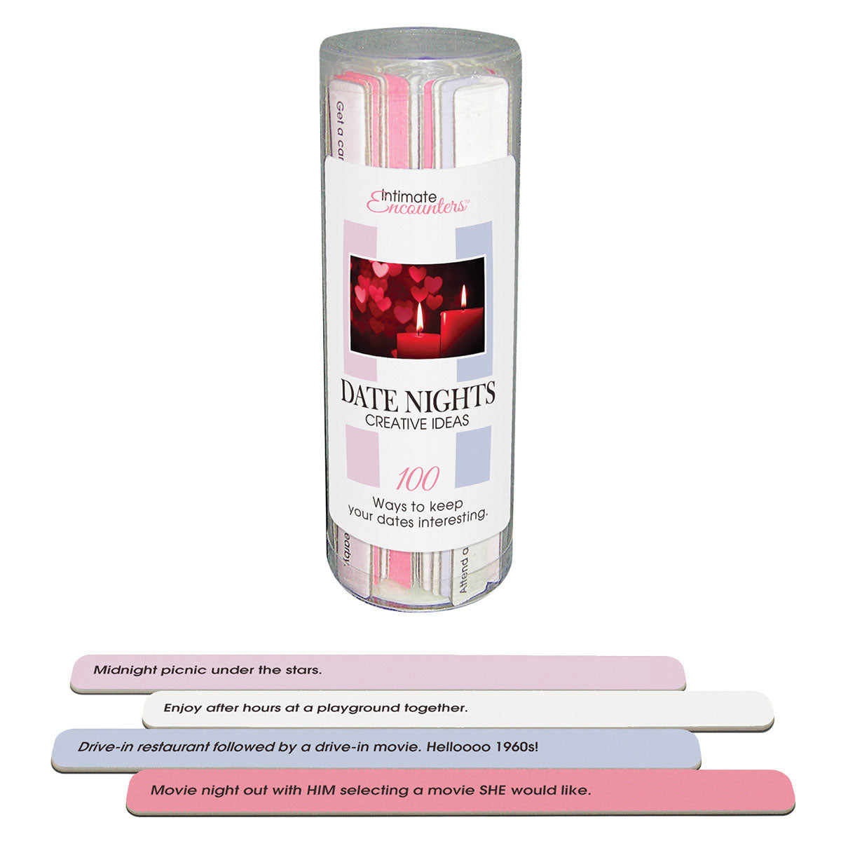 100 ways to keep dates interesting! Whenever a couple needs a date night idea, select an idea stick. Read both sides of the stick with a significant other and choose the one to be carried out. Note: Some may wish to display these sticks in a decorative bowl/plate or on a pillow or nightstand.